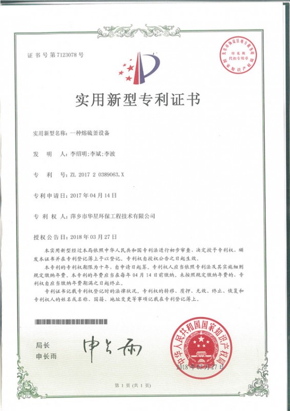 - 一種濃硫酸自動脫水塔--實用新型專利證書